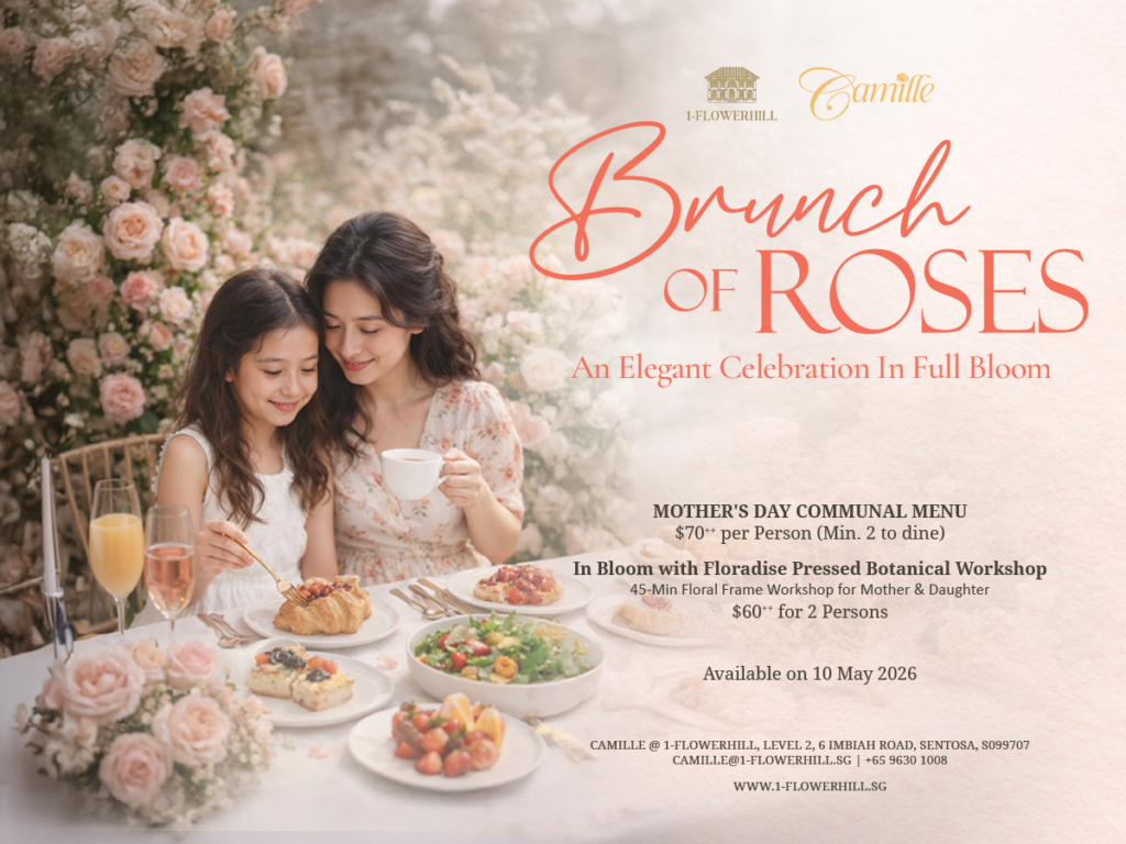 Camille’s Brunch of Roses is available on Sunday, 10 May 2026. For specific seating times and availability, book via SevenRooms at sevenrooms.com/experiences/camille/an-elegant-celebration-in-full-bloom-6237615371370496 or contact the team at enquiry@1-flowerhill.sg or WhatsApp +65 9630 1008.